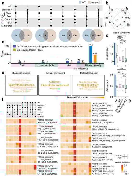 Furthermore, Bedtools was utilized to identify potential cis-regulated target PCGs located within 100 kb upstream and downstream of lncRNAs. Through Pearson correlation coefficient analysis (PCC ≥ 0.9), a series of cis-regulated target PCGs were scanned. Figure 5c compared the target genes of lncRNAs, and there were 481 cis-regulated target PCGs of OsOSCA1.1-related hyperosmolarity stress-responsive lncRNAs in roots, while the number of salt stress-related target genes in roots was very small (Table S8). In addition, co-responsive lncRNAs might play a role in sensing both salt and hyperosmolarity stress, and 21 potential PCGs had a high expression correlation with 72 lncRNAs. The length and GC content of co-responsive lncRNAs showed a transition state between salt stress-responsive and hyperosmolarity stress-responsive lncRNAs (Figure 5c,d; ns: p > 0.05; *: p < 0.05, ***: p < 0.001, ****: p < 0.0001, two-sided Mann–Whitney U test). To further understand the related functions of this characteristic component, we organized GO entries (level 3) for the genes. Cis-regulated target PCGs of OsOSCA1.1-related hyperosmolarity stress-responsive lncRNAs were mainly associated with “biosynthetic process”, “response to stress”, “cytoplasm”, “intracellular anatomical structure”, “hydrolase activity”, and “protein binding” (Figure 5e).