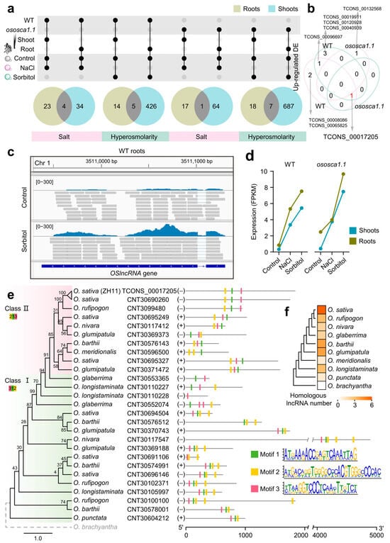 Screening and conservation of stress-activated lncRNAs in rice. (a) Selection of up-regulated DElncRNAs both in rice shoots and roots (stress-activated lncRNAs). (b) Common and unique stress-activated lncRNAs. (c) Genomic location and transcription peak of TCONS_00017205 (OSlncRNA) in WT roots using IGV. (d) OSlncRNA expression patterns in aboveground and underground parts under different stress treatments. (e) Phylogenetic tree and motif evolution history of OSlncRNA and its homology (Bootstrap = 5000). Relative transcription directions are indicated by positive (+) and negative signs (−). (f) Homologous lncRNA numbers in ten Oryza species.