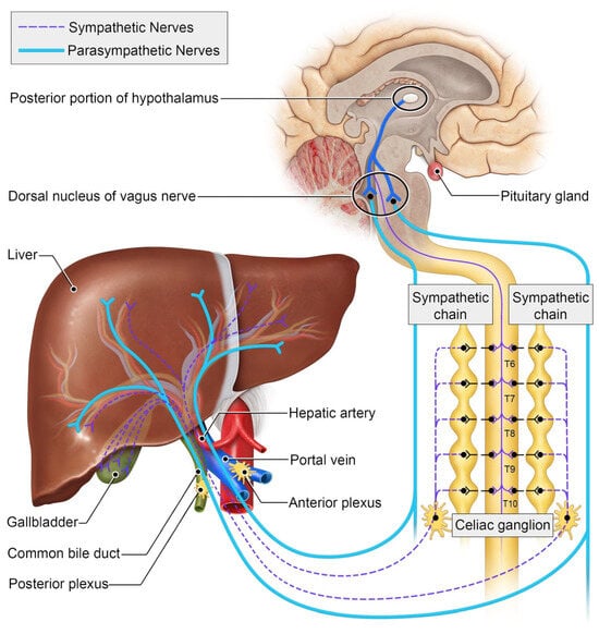 The nervous system additionally plays a key role in primary liver diseases. For example, excess sympathetic tone to the liver is a driver of nonalcoholic fatty liver disease (NAFLD) [25,26]. Interestingly, while an increase in sympathetic nerve fibers has been observed in early NAFLD, it appears that these fibers atrophy and are eliminated in chronic disease. In murine studies, sympathectomy effectively reversed steatosis independent of other risk factors such as diet and body weight [27,28], while excess sympathetic stimulation caused the opposite effect.