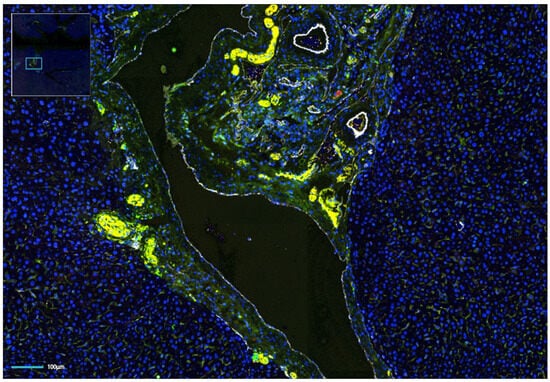 A type of volumetric imaging called immuno-enabled three-dimensional imaging of solvent-cleared organs (iDISCO) was used along with sheet fluorescence microscopy to investigate the arrangement of nerves and blood vessels in the liver of mice [27]. Noradrenergic nerve axons formed a network around the four branches in the left lateral liver lobe. The portal area and central veins exhibited a concentration of nerves [27]. Three-dimensional segmentation revealed that wider nerve fibers were primarily located around the artery and bile duct, while thinner fibers created an intricate network around the different components of the portal triad [27]. Different nerve types were identified through various markers such as tyrosine hydroxylase (TH) for sympathetic nerves, PGP9.5 for general nerves, vesicular acetylcholine transporter (VAChT) for parasympathetic nerves, and calcitonin-gene-related peptide (CGRP) for primary sensory nerves [29]. Additionally, the authors observed that fibers penetrated the liver tissue and noticed minimal staining after treatment with the neurotoxin 6-hydroxydopamine, which gradually recovered over time [27]. Examination of CGRP staining revealed distributed nerve fibers surrounding major portal branches without noticeable differences in steatotic/steatohepatitis samples compared with control samples [27].