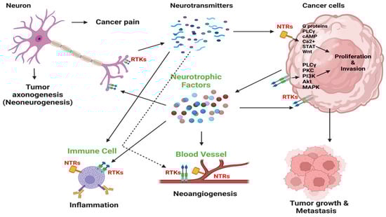 Nerve–cell communication within tumors. Nerves infiltrate the tumor microenvironment and stimulate cancer cell growth and metastasis by releasing neurotransmitters like catecholamines, acetylcholine, and neuropeptides. This initiates signaling pathways for cancer cell growth and invasion via neurotrophin receptors (NTRs). Cancer cells release neurotrophic growth factors such as NGF, promoting nerve infiltration into the tumor, also known as axonogenesis or neo-neurogenesis, and also receptor tyrosine kinase (RTK)-mediated autocrine stimulation. This reciprocal interaction fuels tumor development and affects the tumor microenvironment, leading to inflammation and angiogenesis. Cancer-induced pain may also result from tumor innervation. PLCγ, phospholipase C γ; cAMP, cyclic adenosine monophosphate; PKC, protein kinase C. Adapted from Jonling et al. [37].