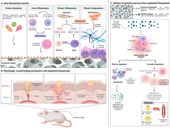 Host responses to implanted biomaterials. (A) Primary issues linked with host reactions after the implantation of biomaterials [48]. (B) The stages of wound healing in the presence of implanted biomaterial involve a dynamic interaction between the extracellular matrix and different cell types, including endothelial cells, platelets, fibroblasts, keratinocytes, and macrophages [67]. (C) Release of particles and ions from the implanted biomaterial and the subsequent degradation process [28,68].