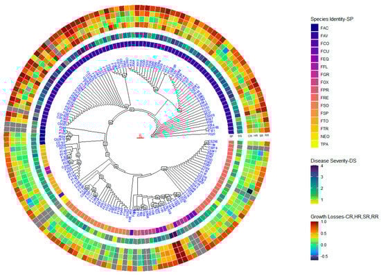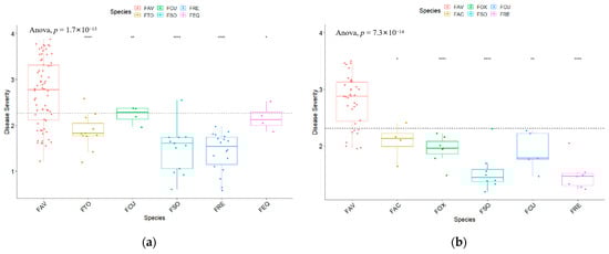 | Species a | Disease Severity (0–4) b | Reduction in Emergence c (%) | Reduction in Height d (%) | ||||||||||||