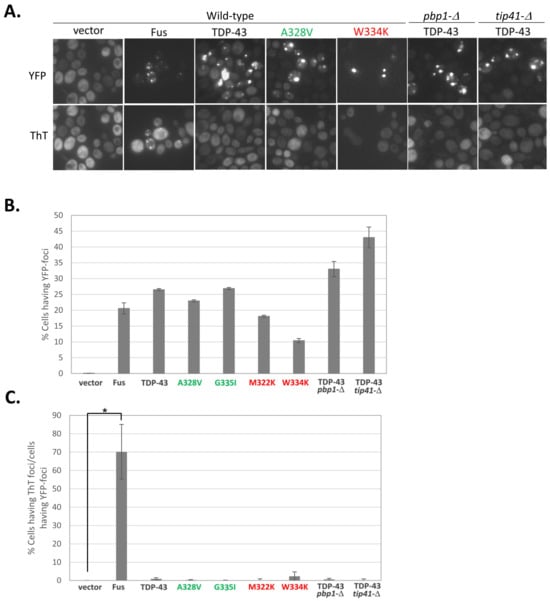 As seen previously [7,35], cells transformed with YFP (Yellow Fluorescent Protein) tagged FUS or TDP-43 form fluorescent foci visible with a YFP filter. Only the FUS aggregates stain with thioflavin T, as seen with a CFP filter (Figure 1). Thus, wild-type TDP-43 aggregates are not amyloid. We also determined whether the larger more stable TDP-43 aggregates formed by mutations that reduce TDP-43 toxicity, e.g., the mutation with the alanine at position 328 changed to valine (A328V) or the glycine at position 335 changed to isoleucine (G335I), were amyloid. To do this, we attempted to stain cells expressing these mutant alleles with thioflavin T. Thioflavin T did not stain these aggregates, so it appears that they also do not form amyloids. Likewise, thioflavin T did not stain foci formed by wild-type TDP-43 in yeast with extragenic deletions (pbp1-Δ and tip41-Δ) that reduce TDP-43 toxicity, nor small unstable TDP-43 foci near nuclei formed by TDP-43 mutants that enhanced toxicity, e.g., the mutation with the tryptophan at position 334 changed to lysine (W334K) or the methionine at position 322 changed to lysine (M322K), were not amyloid (Figure 1).