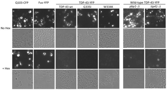 Hexanediol experiments were conducted as previously described [51]. Cells transformed with plasmids encoding wild-type or mutant TDP-43-YFP were cultured overnight in glucose medium; then, TDP-43-YFP was overexpressed in plasmid-selective galactose medium for an additional 4 h, after which the cells were incubated with 2 mg/mL digitonin, with or without 10% 1,6-hexanediol, for 5 min before being photographed with YFP filters.