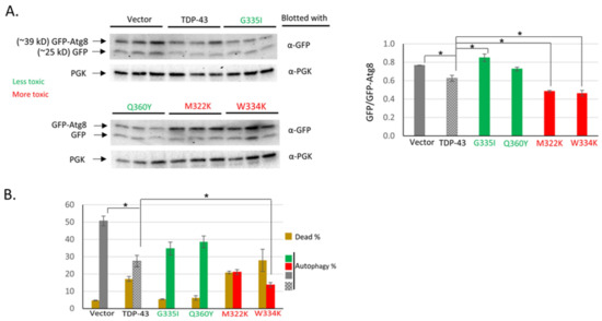 As seen previously [32], the overexpression of wild-type TDP-43 significantly reduced autophagy relative to the vector control. Using GFP-ATG8 (Green Fluorescent Protein fused to autophagy-related protein 8) immunoblotting to measure autophagy showed that the expression of the more toxic TDP-43 mutants M322K and W334K reduced autophagy even more than wild-type TDP-43. In contrast, the expression of the TDP-43 mutants G335I and Q360Y with reduced toxicity had no effect on autophagy compared to the vector control (Figure 3A).