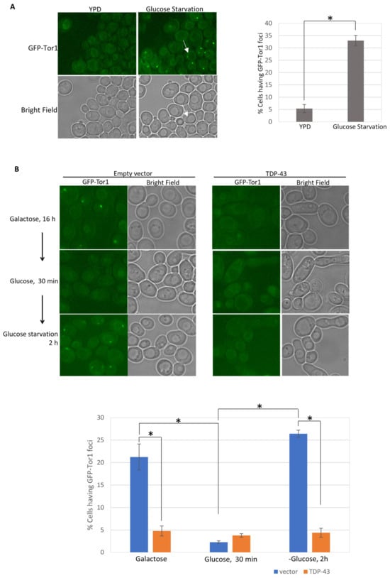 TDP-43 inhibits TOROID formation on galactose or caused by glucose starvation. In the absence of TOROIDs, integrated GFP-TOR1 (green fluorescent protein-tagged target of rapamycin) is diffuse in the cytoplasm and can be seen in the vacuolar membrane [34]. TOROIDs appear as GFP-TOR1 foci on the vacuole membrane [34]. Dead cells auto fluoresced under the DsRed and GFP filters and were excluded from the calculations. (A) Glucose starvation induces TOROID formation in the absence TDP-43 expression. Cells expressing GFP-TOR1 were examined with the GFP filter of a Nikon fluorescence microscope (photographed with a 100×/1.2 oil objective with 1.3 s exposure), before and after glucose starvation. White arrows point to an example of a vacuole in the bright field and the corresponding appearance of GFP-TOR fluorescence in that vacuolar membrane with TOROID focus on the membrane. The number of live cells with GFP-TOR1 foci were counted and averaged from about 500 cells from three independent subclones. Error bars represent the SEM calculated from three independent subclones. * indicates p < 0.05 in a paired two-tailed t-test. (B) The presence of TDP-43 reduces TOROID formation on galactose or under glucose starvation. Cells transformed with an empty vector (pGAL1) or TDP-43-expressing vector (pGAL1-TDP-43) and expressing GFP-TOR1 were grown in galactose to allow for the expression of TDP-43. TOROIDs appeared only in control cells without TDP-43. Subsequent growth on glucose for 30 min caused the galactose-induced TOROIDs to disappear. Following 2 h of glucose starvation, TOROIDs reappeared in cells without TDP-43, but TOROIDs did not appear in cells with TDP-43. The number of live cells with GFP-TOR1 cytoplasmic foci were averaged from about 500 cells of three independent transformants. Error bars represent the SEM calculated from three independent transformants. * indicates p < 0.05 in a paired two-tailed t-test. All photographs in A are at same magnification. Photographs in B are enlarged relative to A but all photographs in B are at the same magnification.
