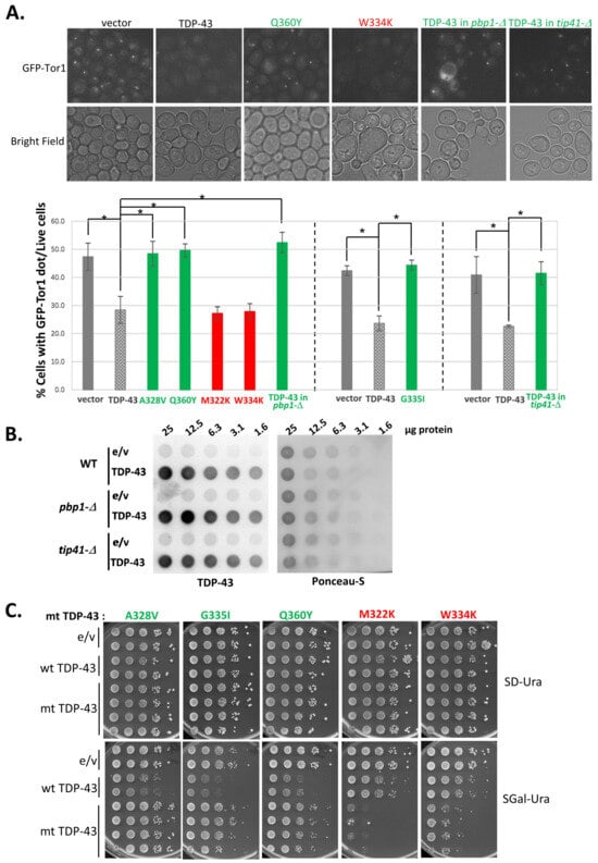 We used growth on galactose to examine the effects of TDP-43 mutations on TOROID formation. Transformants with vector control, or plasmids expressing wild-type TDP-43 or mutants under the control of GAL1 grown in plasmid-selective glucose medium, were transferred to synthetic galactose medium and grown for 16 h. In the absence of TDP-43, this induced the frequent formation of a single GFP-TOR1 aggregate per cell, indicative of TOROID formation. However, the overexpression of TDP-43 significantly reduced the fraction of cells with such aggregates (Figure 5A). Furthermore, TDP-43 mutations that reduced (A328V, Q360Y, G335I), but not those that enhanced (M322K, W334K), TDP-43 toxicity restored GFP-TOR1 aggregation (Figure 5A). The data in Figure 5C confirm that the TDP-43 mutants expressed in our experiments had the previously expected [31] effects on toxicity. Likewise, when either TIP41 or PBP1 was deleted, which reduced TDP-43 toxicity [19,32], TDP-43 expression no longer affected TOROID formation (Figure 5A). We used a dot-blot assay to confirm that the isogenic wild-type, pbp1-Δ, and tip41-Δ strains expressed TDP-43 at equal levels (Figure 5B). In summary, the expression of TDP-43 reduces TOROID formation, but extragenetic modifiers or mutations in TDP-43 that reduce its toxicity prevent this.