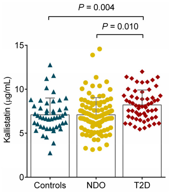 Mean concentrations of kallistatin in control (7.09 ± 1.91 μg/mL; marked with blue triangles), nondiabetic obese (NDO; 7.08 ± 1.96 μg/mL; yellow dots), and obese patients with type 2 diabetes (T2D; 8.21 ± 1.70 μg/mL; red squares). Differences were calculated using one-way ANOVA (p = 0.004 between controls vs. T2D and p = 0.010 between NDO vs. T2D, respectively). Columns represent means and whiskers represent standard deviations in the figure.