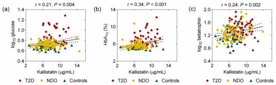 The elevated serum kallistatin level and its positive correlation with HbA1c in our T2D patient group corroborates the results of previous studies and confirms the key role of persistent hyperglycemia in the upregulation of kallistatin production [5,6]. Betatrophin, also known as angiopoietin-like protein 8 (ANGPTL8), is a protein that mainly plays a role in lipid metabolism [16]. Elevated serum betatrophin levels have been reported previously in T2D and obese patients [13,17,18,19]. Therefore, its significant positive correlation with kallistatin in NDO patients and in the whole study population is probably not surprising but a novel finding. However, this association was not detected in T2D patients and controls.
