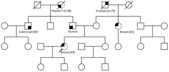 The proband was diagnosed at 49 years of age with TNBC on the left breast and axillary lymphadenopathy. She received neoadjuvant chemotherapy (dose-dense doxorubicin–cyclophosphamide (AC) X4_ 12 paclitaxel) from May 2021 to November 2021, followed by total mastectomy and axillary lymph node dissection in December 2021. Histological analyses revealed an aggressive tumor classified as ypT3 ypN3a (capsular rupture was noted in 26 of 31 lymph nodes) and, thus, RCB III. Adjuvant radiotherapy was administered during February and March 2022. A subsequent assessment of extension identified no metastatic lesions. Given her young age, the patient was referred to the clinical genetics department of Grenoble University Hospital. Her maternal family history comprised an aunt diagnosed with hormone-receptor-positive (HR+) BC at age 65 and a grandfather who died aged 79 from prostate cancer. On the paternal branch, her father developed gastric cancer after age 70, an uncle underwent treatment for colorectal cancer at age 69, and her grandmother died at age 38, possibly from hepatic neoplasia. An HBOC genetic analysis was requested because of the patient’s own diagnosis of TNBC before age 50 (Figure 1). This analysis identified a duplication of BRCA1 exons 4 to 6, as well as a heterozygous missense variant in TP53 exon 5 (c.472C > T; p.(Arg158Cys)). In line with current recommendations on the interpretation of intragenic duplications, we further characterized the BRCA1 duplication. While awaiting its definitive characterization, it has been classified likely PV (ACMG classification [11]). As a result, the patient was able to benefit from treatment with a PARP inhibitor from April 2022 to January 2023. Concomitantly, preventive mastectomy of the right breast revealed a TNBC (2 mm) without vascular emboli or perineural sheathing, classified pT1a Nx. Due to the TP53 mutation, in January 2023, a full-body magnetic resonance imaging (full-body MRI) was performed. Spinal bone lesions were discovered and biopsies confirmed metastatic relapse, despite the PARP inhibitor treatment. During March and May 2023, the patient received a first-line therapy for metastatic BC. Her general condition deteriorated suddenly and she died in June 2023, i.e., 4 months after the diagnosis of metastatic relapse. Chemo-resistance, metastatic relapse just 1 year after complete surgical management and survival of 4 months in the metastatic phase confirm that this patient had an extremely aggressive tumor.