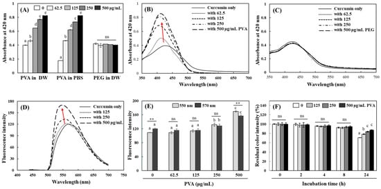 Effects of PVA and PEG on absorbance and fluorescence properties and stability of curcumin. Peak absorbance changes of curcumin (40 μM) in DW and PBS in the presence of different concentrations of PVA and PEG (0–500 μg/mL) were measured (A). The absorbance spectra of curcumin (40 µM) dissolved in DW in the presence of different concentrations of PVA (B) and PEG (C) (0–500 μg/mL) were scanned at 350–700 nm. Changes in fluorescence emission spectrums at 450–700 nm (D) and emission fluorescence intensity at 550 and 570 nm (E) (Ex. 440 nm) of curcumin dissolved in DW by different concentrations of PVA were also analyzed. Curcumin in DW with different concentrations of PVA was incubated at RT in the dark, and the color intensity of curcumin during 24 h was analyzed at 420 nm (F). Each value represents the mean ± SD (n = 3–6). Different letters indicate a significant difference (p < 0.05) and **, significantly different from each other according to Student’s t-test (**, p < 0.01) in (E). ns—not significant.