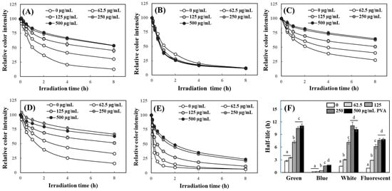 Effects of PVA on the photostability of curcumin under irradiation of different light sources. Curcumin (40 μM) dissolved in DW containing different concentrations of PVA (A,C–F) or PEG (B) was irradiated under fluorescent light (A,B), green (C), white (D), and blue (E) LED (each 10 W/m2) for 8 h at RT, and photodegradation of curcumin was detected at 420 nm. The half-lives for the color degradation in the presence of PVA (F) were also calculated. Each value represents the mean ± SD (n = 4) and different letters indicate a significant difference (p < 0.05) in (F).