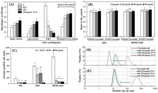 Changes in dispersion stability and physicochemical property of curcumin solution by PVA. The solution stability of curcumin dissolved in DW containing different concentrations of PVA under centrifugal force (14,000 RCF) was analyzed as described in the Materials and Methods section (A). Changes in the viscosity of curcumin solution in DW and RPMI 1640 medium by PVA were measured (B). The average particle size of curcumin solution in DW, PBS, and RPMI 1640 medium (C), and the size distribution of curcumin particle in DW (D) and RPMI 1640 (E) were also analyzed using a Zeta potential analyzer. Each value represents the mean ± SD (n = 3–6), and different letters indicate a significant difference (p < 0.05).