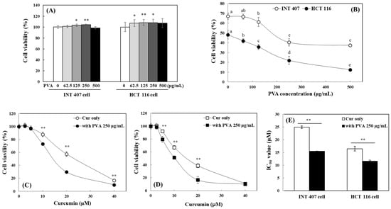 Changes in curcumin cytotoxicity against INT 407 and HCT 116 cells by PVA. Effects of different concentrations of PVA only (A) or with 20 μM curcumin (B) on the viability of INT 407 and HCT 116 cells were analyzed after 24 h treatment. Concentration-dependent effects of curcumin with or without PVA on viabilities of INT 407 (C) and HCT 116 (D) cells were analyzed after 24 h incubation, and IC50 values were also calculated (E). Each value represents the mean ± SD (n = 8). *, **, significantly different with and without PVA according to Student’s t-test (*, p < 0.05; **, p < 0.01) (A,C–E). Different letters indicate a significant difference (p < 0.05) based on one-way ANOVA and Tukey’s HSD test (B).