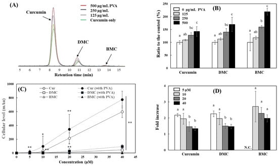 Modulation of cellular uptake of curcuminoids by PVA. INT 407 cells were incubated with 20 μM curcumin in the presence of different concentrations of PVA (0–500 μg/mL) for 90 min, and individual curcuminoid levels in cells were analyzed using the HPLC. Representative chromatograms in the current HPLC system (A) and relative intracellular curcuminoid levels (B) treated with different concentrations of PVA were shown. INT 407 cells were also incubated with different concentrations of curcumin (0–40 μM) in the presence of PVA (250 μg/mL) for 90 min, and intracellular individual curcuminoid levels (C) and relative levels (a fold increase based on each control) (D) were analyzed. Each value represents the mean ± SD (n = 4–6). Different letters indicate a significant difference (p < 0.05) based on one-way ANOVA and Tukey’s HSD test (B,D). *, **, significantly different from control according to Student’s t-test (*, p < 0.05; **, p < 0.01, in (C)).