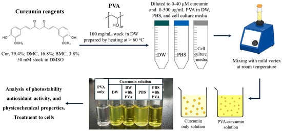 A general scheme for the preparation of a solution containing curcumin and PVA is shown in Figure 7. Curcumin (40 μM) was dissolved in DW or PBS in the presence of different concentrations of PVA (0–500 μg/mL), and changes in the absorbance spectrum of curcumin by PVA were scanned at 350–700 nm using a microplate reader (SpectraMax M2). The fluorescence emission spectrum of curcumin solution was also analyzed at 450–700 nm (Ex. 440 nm) (SpectraMax M2). In addition, the change in the peak absorbance of curcumin with PVA concentration was also measured at 420 nm. To measure the change in chemical stability, the solution prepared by the above method was stored at room temperature (RT), and the absorbance change at 420 nm was measured for 24 h. For evaluation of the photostability of curcumin solutions, an ordinary household fluorescent lamp (27 W, FPL-27W EX-D) with at least three emission peaks, including 440, 550, and 620 nm, and a green (peak emission at 518 nm), white, and blue (peak emission at 447 nm) LED irradiation device (Bissol LED Co., Seoul, Republic of Korea) were used. The characteristics, including the emission spectra of the light sources, are shown in Figure S1. Curcumin (40 μM) solutions dissolved in DW containing different concentrations of PVA or PEG (0–500 μg/mL) were prepared, and 200 μL of the solution was added to each well of a 96-well plate. The plate was irradiated under each light source (10 W/m2 each) for 8 h at 25 °C, and photodegradation of curcumin was detected at 420 nm at each time point using a microplate reader (Spectra Max M2, Molecular device, Sunnyvale, CA, USA).