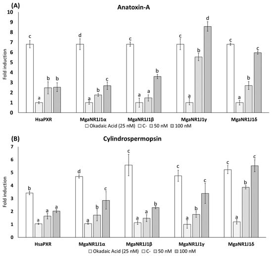 Our study identified MgaNR1J1γ as the paralog most sensitive to the tested toxins, followed by MgaNR1J1δ, with over 7- and 5-fold induction, respectively. However, STX and CYN represent exceptions to this pattern, exerting their most pronounced effect on MgaNR1J1δ, with MgaNR1J1γ following in sensitivity (Figure 1, Figure 2 and Figure 3). The differential sensitivity of various MgaNR1J1 paralogs to different toxins demonstrates a nuanced response mechanism within the organisms. Additionally, this finding suggests that marine mussels may exhibit a consistent activation of NR1J1 paralogs regardless of the origin of the toxins, highlighting the importance of understanding the broader detoxification mechanisms employed by bivalves in response to diverse toxin exposures, irrespective of their habitat.