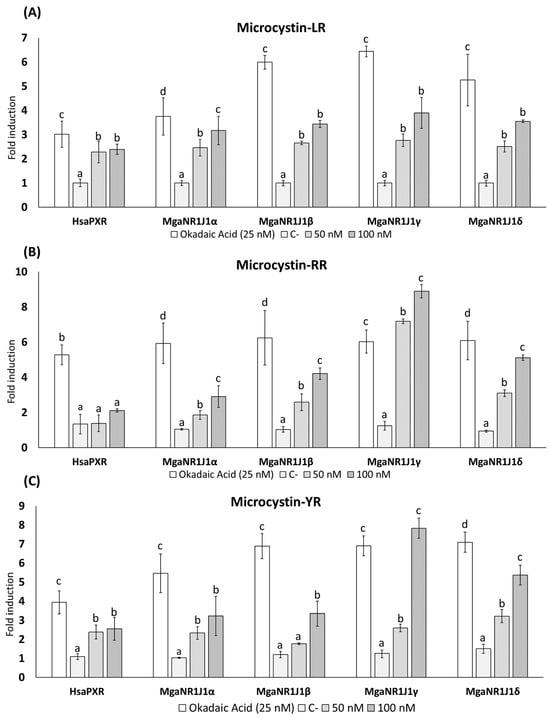 Firefly luciferase transactivation activity mediated by marine mussel NR1J1 paralogs with the freshwater cyanotoxins (A) Microcystin-LR, (B) Microcystin-RR, and (C) Microcystin-YR. Human PXR was used as a control assay and OA as a positive control. Values are expressed as mean ± SEM of three replicates. Distinct lowercase letters indicate values significantly different at p < 0.01 according to one-way analysis of variance (ANOVA) per gene and Tukey’s multiple range test (n = 3).