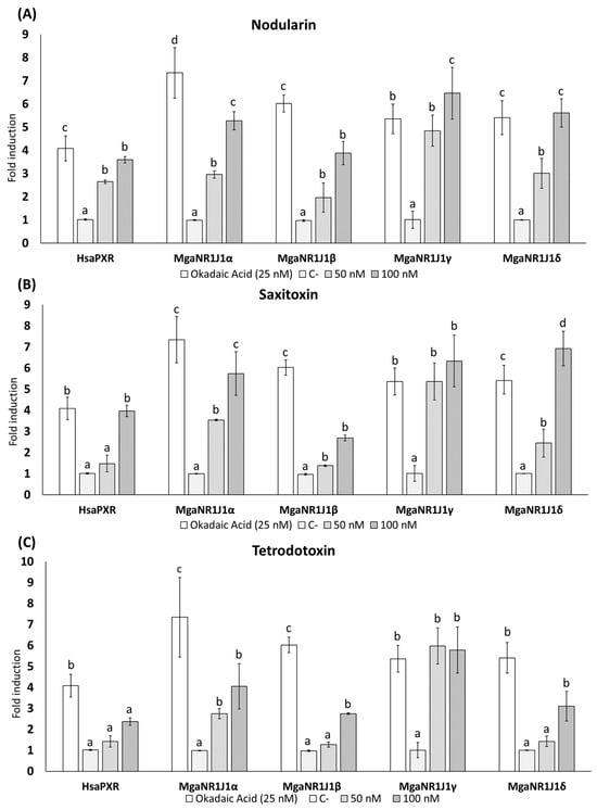 Firefly luciferase transactivation activity mediated by marine mussel NR1J1 paralogs with 3 marine algal toxins: (A) Nodularin, (B) Saxitoxin, and (C) Tetrodotoxin. Human PXR was used as a control assay and OA as a positive control. Values are expressed as mean ± SEM of three replicates. Distinct lowercase letters indicate values significantly different at p < 0.01 according to one-way analysis of variance (ANOVA) per gene and Tukey’s multiple range test (n = 3).