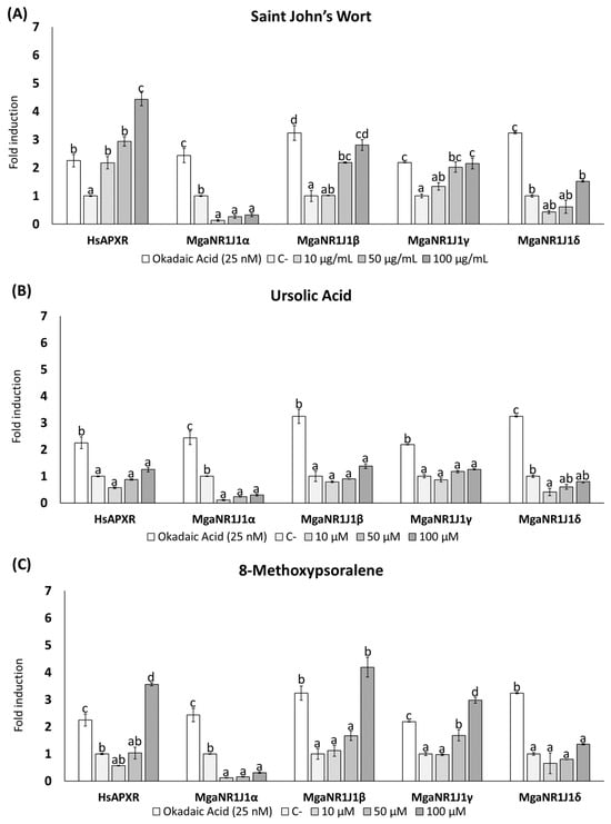 In the case of SJW (Figure 4A), HsaPXR was the most sensitive (4.43-fold at the highest concentration), with significant concentration-dependent differences compared to the negative control. Significant changes were found for the paralog MgaNR1J1β at the highest concentration, while the MgaNR1J1γ paralog was transactivated significantly at 50 and 100 μg/mL The results obtained with UA are shown in Figure 4B. No significant differences were found among the tested concentrations and the negative control for HsaPXR. Exposure to UA, similarly to that with SJW, led to a significant decrease in luciferase signal for MgaNR1J1α compared to the negative and positive controls. The same was observed with the lowest test concentration for MgaNR1J1δ. No significant differences were found in the transactivation of MgaNR1J1β and MgaNR1J1γ across all the concentrations assayed. Exposure to 8M (Figure 4C) significantly induced a 3.56-fold increase in luciferase activity with HsaPXR at the highest concentration assayed (100 μM). Consistent with the other compounds, a significant decrease in luciferase signal was observed across all concentrations tested for MgaNR1J1α. No significant differences were found in MgaNR1J1δ. However, the MgaNR1J1β and MgaNR1J1γ paralogs had significantly activated luciferase expression with 8M at 100 μM and 50/100 μM, respectively.