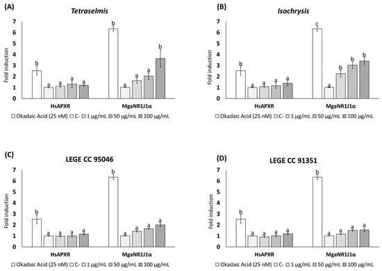 The transactivation of HsaPXR and MgaNR1J1α upon exposure to different microalgae extracts is shown in Figure 5. No significant changes in luciferase activity induced by HsaPXR were found after exposure to microalgae extracts compared to the negative control. However, Tetraselmis and Isochrysis extracts significantly increased luciferase activity induced by MgaNR1J1α, while exposure to LEGE CC 95046 and LEGE CC 91351 extracts had no effects. The highest signal was produced by Tetraselmis extract (Figure 5A) at the highest concentration (100 μg/mL), with an increase of 3.63-fold induction. Moreover, the transactivation was more evident with the Isochrysis extract (Figure 5B), with significant differences at all concentrations tested.