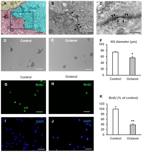 Effect of octanol treatment on neural progenitor cell proliferation. (A) Electron microscopy image of cells within a neurosphere. The different identified cells have been pseudocolored. The framed region shows an example of a zone of gap junction-like contact between two apposed cells. (B) Shows the framed region of (A) at higher magnification. (C) Shows another example of a gap junction-like contact between two intimately apposed neurosphere cells. Note the limits of gap junction-like contacts (delimited by arrows) in the two cell membranes and adjacent desmosomal-like junctions (arrowheads). Scale bars: 20 µm in (A), and 5 µm in (B,C). Neural progenitor cells of the postnatal rat subventricular zone were cultured in the absence (control) or presence of the gap junction inhibitor octanol. The diameter of the formed neurospheres 72 h after seeding, as well as the percentage of bromodeoxyuridine (BrdU) incorporation during the last 12 h of culture were evaluated. (D,E) Phase-contrast photomicrographs of neurospheres in control cultures (D) and in cultures treated with 0.5 mM octanol (E). Scale bar: 100 µm. (F) Graph showing the neurosphere (NS) diameter (in µm) in each experimental condition. Data are the mean ± SEM, n = 5, * p < 0.05, Student’s t test. (G–J) Epifluorescence images showing BrdU immunohistochemistry (in green) in cells from gently disaggregated neurospheres obtained from a control culture (G) and a culture treated with 0.5 mM octanol (H). The total number of cells in each field was identified via DAPI staining (in blue, (I,J)). Scale bar: 50 µm. (K) Graph showing the percentage of BrdU incorporation in both experimental conditions. Data are the mean ± SEM, n = 8, ** p < 0.001, Student’s t test.