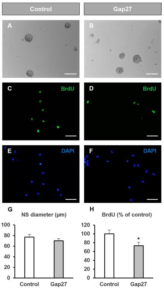 Effect of Gap27 treatment on neural progenitor cell proliferation. Neural progenitor cells of the postnatal rat subventricular zone were cultured in the absence (control) or presence of the Cx43 gap junction inhibitor peptide Gap27. The diameter of the formed neurospheres 72 h after seeding as well as the percentage of bromodeoxyuridine (BrdU) incorporation during the last 12 h of culture were evaluated. (A,B) Phase-contrast photomicrographs of neurospheres in control cultures (A) and in cultures treated with 0.3 mM Gap27 (B). Scale bar: 100 µm. (C–F) Epifluorescence images showing BrdU immunohistochemistry (in green) in neurosphere-derived cells obtained from control cultures (C) and cultures treated with 0.3 mM Gap27 (D). The total number of cells in each field was identified via DAPI staining (in blue, (E,F)). Scale bar: 50 µm. (G) Graph showing the neurosphere (NS) diameter (in µm) in each experimental condition. Data are the mean ± SEM, n = 6, p > 0.05, Student’s t test. (H) Graph showing the percentage of BrdU incorporation in both experimental conditions. Data are the mean ± SEM, n = 8, * p < 0.05 Student’s t test.