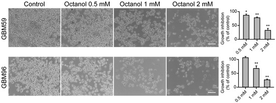 Effect of octanol on glioblastoma cell growth. Cell viability in GBM cells treated for 72 h with different concentrations of octanol (0.5, 1 and 2 mM). Phase-contrast photomicrographs in the left panel show examples of GBM59 and GBM96 cells in control conditions and after 72 h of treatment with octanol at the indicated concentrations. Scale bars: 100 µm. Bar histograms in the right panel show the growth inhibition (as the percentage with respect to control) of every tested concentration of octanol in GBM59 and in GBM96 cells. Data are the mean ± SEM, n = 6–12, * p < 0.05, ** p < 0.001, compared to control, one-way ANOVA test.