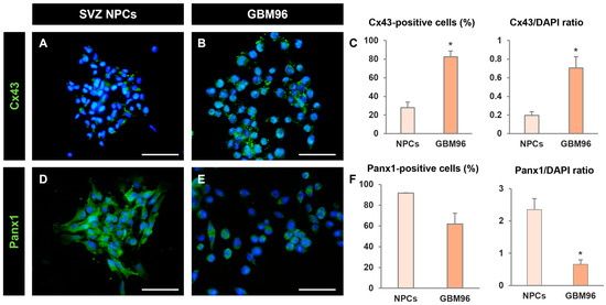 Comparison of hemichannel protein expression between neural progenitor cells and glioblastoma cells. (A,B,D,E) Epifluorescence microscopy images of SVZ NPCs and GBM96 cells after immunostaining for the detection of Cx43 (green, (A,B)) or Panx1 (green, (D,E)). Cell nuclei are identified via staining with DAPI (in blue). Scale bars: 50 µm. (C) Graphs showing the percentage of Cx43-positive cells and the Cx43/DAPI ratio in SVZ NPCs (NPCs) and in GBM96 cells. Data are the mean ± SEM, n = 5, * p < 0.05, GBM96 compared to NPCs, Student’s t test. (F) Graphs showing the percentage of Panx1-positive cells and the Panx1/DAPI ratio in SVZ NPCs (NPCs) and in GBM96 cells. Data are the mean ± SEM, n = 3–5, * p < 0.05, GBM96 compared to NPCs, Student’s t test.