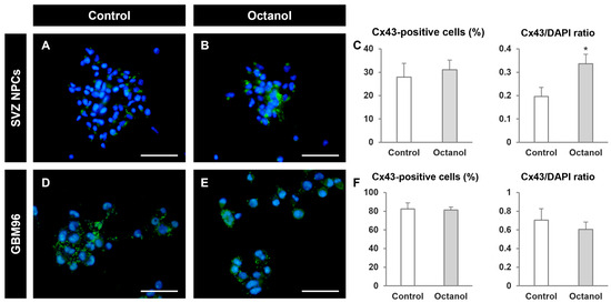 Octanol treatment increased Cx43 expression in SVZ NPCs. (A,B,D,E) Epifluorescence microscopy images of SVZ NPCs and GBM96 cells in control (A,D) and in octanol-treated conditions (B,E) after immunostaining for the detection of Cx43 (green). Cell nuclei are identified by staining with DAPI (in blue). Scale bars: 50 µm. (C,F) Graphs showing the percentage of Cx43-positive cells and the Cx43/DAPI ratio in SVZ NPCs (C) and in GBM96 cells (F), in control conditions and after treatment with octanol 0.5 mM (for NPCs) or 1 mM (for GBM96 cells). Data are the mean ± SEM, n = 5–6, * p < 0.05, GBM96 compared to NPCs, Student’s t test.