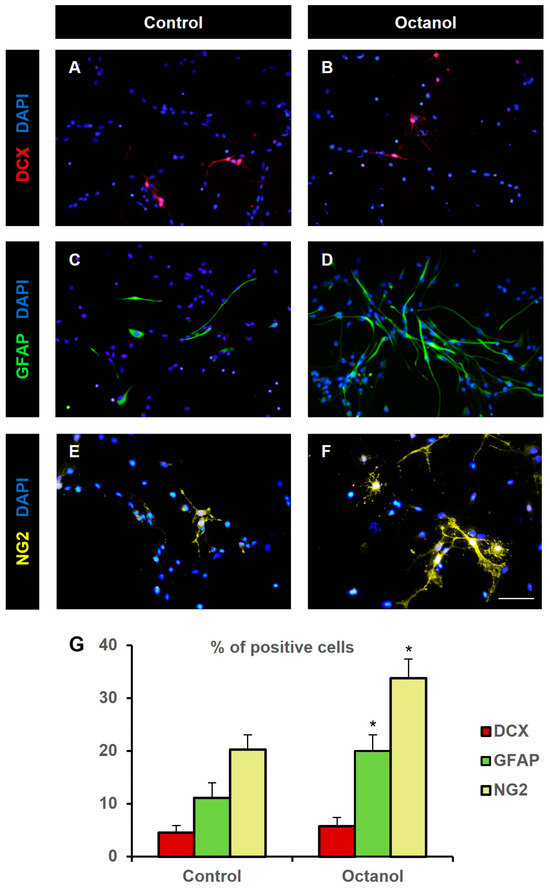 Octanol treatment increased glial differentiation in vitro. Fluorescence microscopy images of neurosphere-derived adhered cells immunostained with antibodies to identify neurons (DCX, red, (A,B)), astrocytes (GFAP, green, (C,D)) and oligodendroglial precursors (NG2, pseudocolored in yellow, (E,F)) and counterstained with DAPI (blue), in cultures treated for 48 h with vehicle (control, (A,C,E)) or 0.5 mM octanol (B,D,F). Note a higher percentage of GFAP- and NG2-positive cells in octanol-treated cultures compared to control ones. Scale bar: 50 µm. (G) Percentage of cells immunoreactive to DCX (red), GFAP (green), and NG2 (yellow) in neurosphere-derived cells grown on adhesive substrate for 48 h and treated either with vehicle (control) or with 0.5 mM octanol. Data are the mean ± SEM of 7 to 8 independent experiments. * p < 0.05 compared to their respective control (Mann–Whitney U test for DCX and GFAP data, Student’s t test for NG2 data).