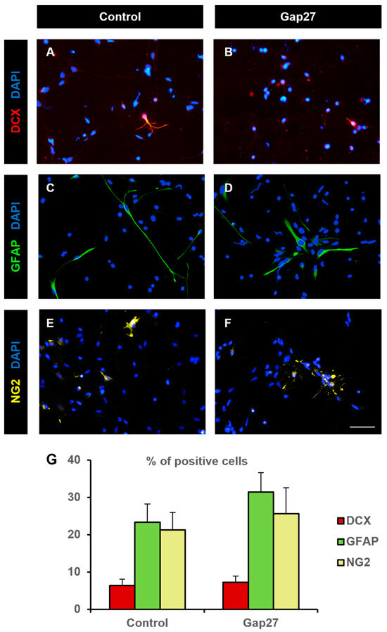 The effect of the Cx43 gap junction-specific blocker Gap27 on cell fate was also analyzed. Treatment of NPCs with 0.3 mM Gap27 cultured on adhesive substrate in the absence of mitogens did not induce any significant modification in the percentage of cells that underwent differentiation towards neurons, astrocytes, or oligodendrocyte precursors (Figure 7). The percentage of NPCs that differentiated to neurons, astrocytes, and oligodendrocyte precursors in control cultures was 6.4 ± 1.7%, 23.3 ± 4.9%, and 21.6 ± 4.6%, respectively (Figure 7A,C,E,G). Similar percentages were obtained in cultures treated with Gap27: 7.2 ± 1.7% neurons, 31.4 ± 5.2% astrocytes, and 25.6 ± 7.0% oligodendrocyte precursors (Figure 7B,D,F,G). Comparisons of these values with their controls revealed no significant differences (Mann–Whitney U test for GFAP data, Student’s t test for DCX and NG2 data, p > 0.05).