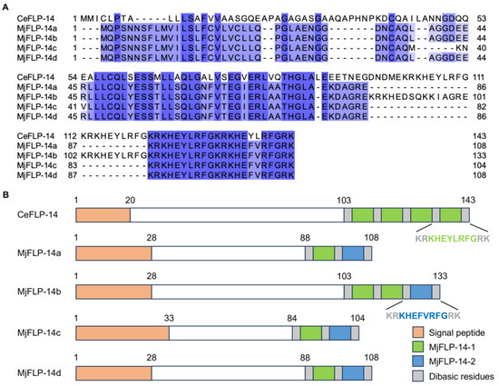 2.4. The Precursors of MjFLP-14 Neuropeptides (Pro-Neuropeptide) Contain Two Neuropeptides