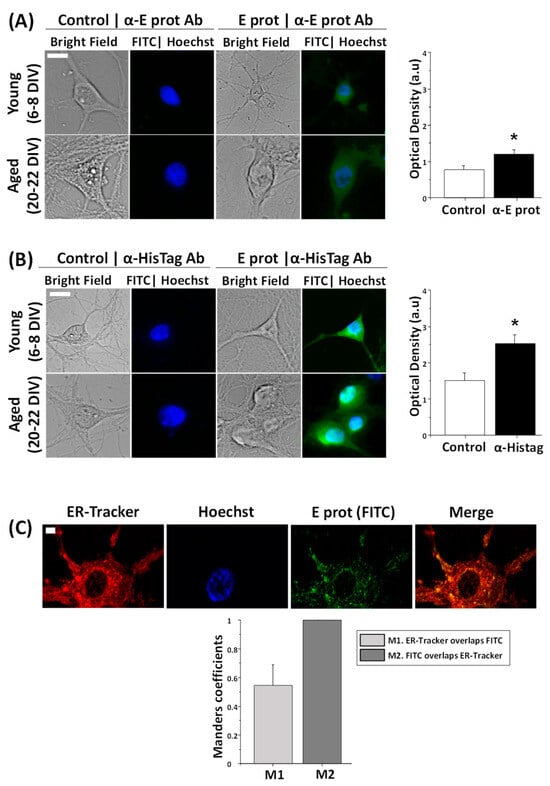 The SARS-CoV-2 E protein is intracellularly located and colocalizes with the endoplasmic reticulum in hippocampal neurons. E protein location was tested in rat hippocampal cultures treated with the vehicle (Control) or the E protein (E protein, 0.6 µg/mL) for 24 h. Immunochemistry experiments were independently performed with two different antibodies, against the E protein and HisTag. Incubation with ER-Tracker allowed one to observe endoplasmic reticulum. (A) Representative bright field and immunofluorescence images of neurons treated with the E protein and nuclei (FITC|Hoechst) taken from young (6–8 DIV) and aged (20–22 DIV) hippocampal neurons using antibodies against the E protein (α-E protein Ab). Alongside is the quantitative age-independent analysis of immunofluorescence intensity levels (Optical density in arbitrary units) for control and E protein (E prot), using E protein antibody. The bars represent the mean ± SEM from 133 and 165 cells from five independent experiments. The scale bar is 10 µm. * p < 0.05 vs. control. (B) The same procedure using HisTag antibody (α-HisTag Ab). Data were taken from 190 and 207 cells from five independent experiments. The scale bar is 10 µm. * p < 0.05 vs. control. (C) Representative confocal fluorescence images from endoplasmic reticulum (ER-Tracker), nuclei (Hoechst), the E protein using E protein antibody (E prot FITC) and the merge of a 21 DIV neuron. The bars represent the Manders coefficient M1 (ER-Tracker overlapping FITC) and M2 (FITC overlapping ER-Tracker) mean ± SEM from 16 cells in three independent experiments. The scale bar is 5 µm.