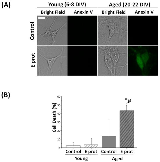 The SARS-CoV-2 E protein induces cell death in aged cultures of rat hippocampal neurons but not in young cultures. Primary hippocampal neuron cultures for 6–8 DIV (young) and 20–22 DIV (aged) were treated for 24 h in the absence or presence of the SARS-CoV-2 E protein. Apoptosis was assessed 24 h later by means of staining with Annexin V. (A) Representative bright field and Annexin V inmunofluorescence images of young (upper) and aged (bottom) hippocampal cultures in the presence (E prot) or absence (Control) of the E protein (0.6 μg/mL). A bar represents 10 μm and applies to all photographs. (B) Percentage of neuron dead cells in control and E protein-treated cells in young and aged cultures. Values represent the mean ± SEM from 865, 880, 561 and 639 cells from seven independent experiments. * p < 0.05 vs. control; # p < 0.05 vs. young cultures.