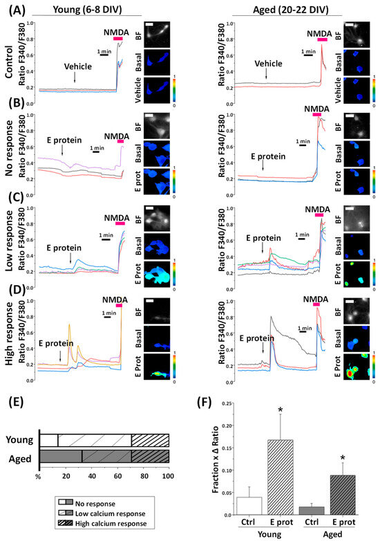On average, we observed that, in young neurons, about 14% of neurons show no response, 57% of them displayed a low response, and the remaining 29% of young cultures exhibited a high response. In aged neurons, 33% of them did not respond to the E protein, while 38% exhibited a low response and 29% a high response. Remarkably, the frequency of aging neurons that respond to the E protein is lower than young neurons.