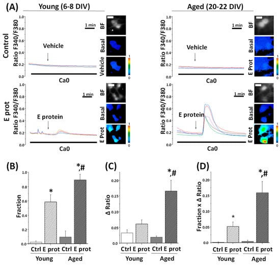 The SARS-CoV-2 E protein induces Ca2+ release from intracellular stores in young and aged hippocampal neurons. The release of Ca2+ store content was tested in hippocampal neurons from short-term (6–8 DIV) and long-term (20–22 DIV) cultures. Cells were loaded with fura2/AM (4 µM) and subjected to fluorescence Ca2+ imaging in external Ca2+-free medium. (A) The pictures show bright field (BF) and pseudocolor images of fluorescence ratios in basal conditions (Basal) and after vehicle (Vehicle) or E protein (E protein) treatment (2 μg/mL), in short-term (6–8 DIV) and long-term (20–22 DIV) cultured neurons. The bar represents 10 μm and applies to all photographs. Traces are representative recordings of fluorescence ratios in individual neurons identified by their morphology. (B) The bars correspond to the average (mean ± SEM) fraction of cells responding to vehicle or E protein, (C) maximum height ratio F340/F380 (Δ ratio) in responsive cells, (D) and the product of both parameters, n = 42, 63, 60 and 59 cells from 17 independent experiments. * p < 0.05 vs. control; # p < 0.05 vs. 6–8 DIV cultures. For (B–D) n = 42, 63, 60 and 59 cells from 17 independent experiments. * p < 0.05 vs. control; # p < 0.05 vs. young (6–8 DIV) cultures.