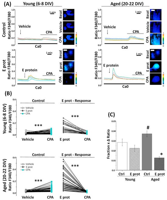 To confirm that the E protein induces Ca2+ release for intracellular stores associated with the ER, we tested the effects of the SERCA pump inhibitor cyclopiazonic acid (CPA) on [Ca2+]cyt before and after E protein presentation. Accordingly, young and aged hippocampal cultures were subjected to Ca2+ imaging and perfused with CPA (10 µM) after treatment with the vehicle or the E protein (2 ng/mL). Figure 5A shows representative single-cell Ca2+ recordings of 6–8 DIV and 20–22 DIV cultured neurons. CPA perfusion in Ca2+-free medium induces a [Ca2+]cyt increase after vehicle treatment, due to the prevailing activity of ER leak channels after SERCA pump inhibition. The size of this rise is also a measure of Ca2+ store content. Notice that the CPA-induced [Ca2+]cyt rise is larger in aged neurons, consistent with the larger Ca2+ store content reported previously by our group in aged neurons [33]. Interestingly, when CPA was added after E protein presentation, the rises in [Ca2+]cyt induced by CPA were eliminated in both young and aged neurons.