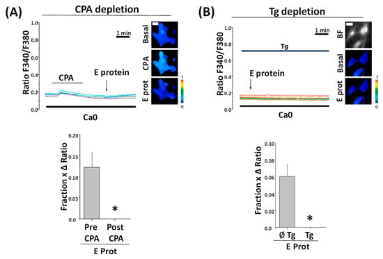 To confirm the source of Ca2+ in E protein-induced rises in [Ca2+]cyt, we next tested the effects of the E protein after full depletion of intracellular Ca2+ stores with CPA and thapsigargin, another SERCA pump inhibitor. In contrast to CPA, Thapsigargin is an irreversible SERCA blocker. Accordingly, cells are treated with thapsigargin off the record and they keep Ca2+ stores empty without the need to perfuse thapsigargin throughout the experiment.