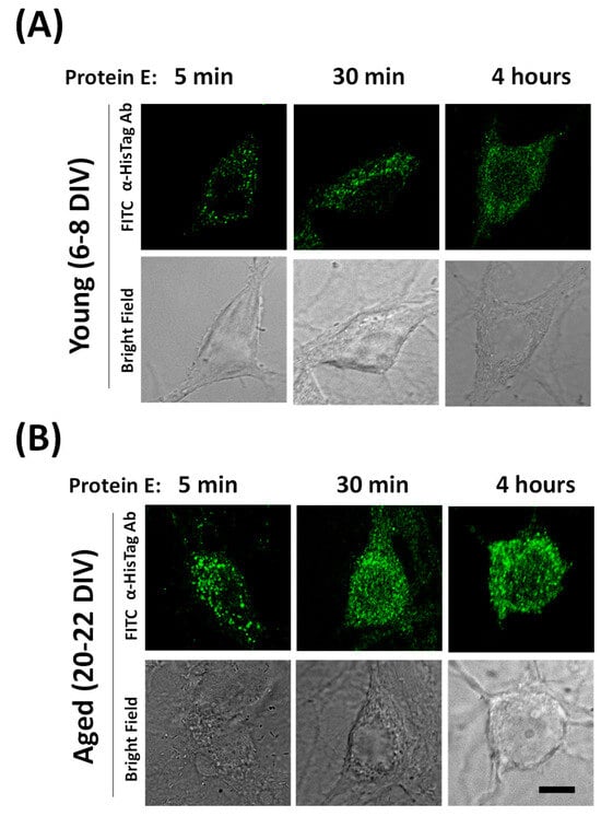 Dynamics of SARS-CoV-2 E protein translocation to endomembranes in hippocampal neurons. The dynamics of E protein location were tested in rat hippocampal cultures treated with the E protein (E protein, 2 µg/mL) for 5, 30 and 240 min (4 h) in (A) young (6–8 DIV) and (B) aged (20–22 DIV) rat hippocampal neurons. Then, cells were fixed and immunochemistry experiments were performed using E protein antibodies and confocal microscopy. Representative immunofluorescence images and the corresponding bright field images are shown. The data are representative of three similar experiments. The scale bar is 10 µm.