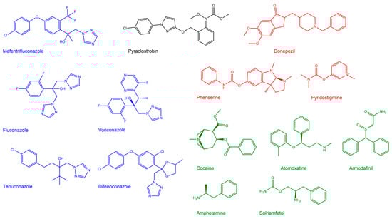 Molecular structure of triazole compounds (blue), anticholinesterase compounds (red) and central nervous stimulants (green). For all of the molecular structures used in this study, please see Figure S1.