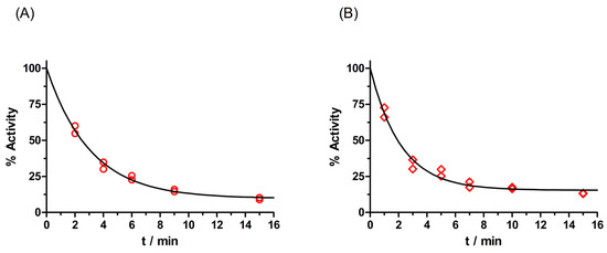 Representative plot of progressive inhibition of AChE (A) and BChE (B) by carbamate pyraclostrobin (c = 50 μM). The theoretical curve (black line) was calculated using Equation (2).