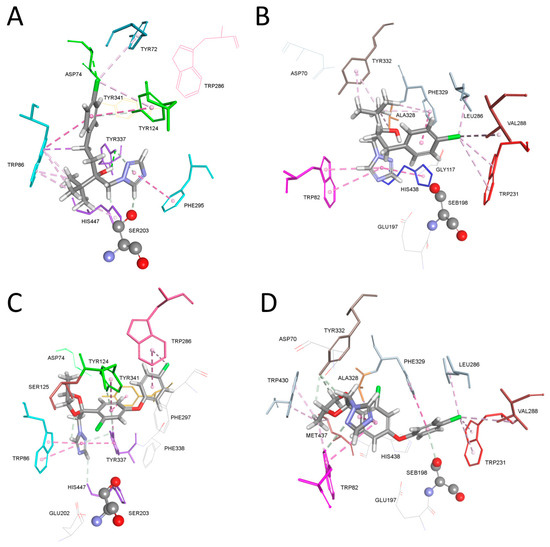 The model of the complex between AChE and the carbamate pyraclostrobin shows the orientation of pyraclostrobin in which the leaving group of the fungicide is positioned opposite to the oxygen (Oγ) of catalytic Ser203 and therefore creates the hydrogen bond with Ser203 (Figure 3C,D). This orientation is in accordance with a nucleophilic attack by the catalytic serine during enzyme progressive inhibition [26,27,28]. The methoxy group, which is a leaving group, is directed toward Phe295 from the acyl binding pocket, creating hydrophobic interactions with Phe295 and His438, and yielding a hydrogen bond with Ser203. The second methoxy group forms interactions with Glu202 and His438, while the benzene ring is stabilized in a π-π sandwich with residues of the choline binding site Trp86 and Tyr337. The pyrazole ring is stabilized in the middle of the AChE active site gorge forming a hydrogen bond with Asp74 from the peripheral binding site, Tyr337 and Tyr341. The stabilization of the 4-chlorophenyl group came from multiple hydrophobic interactions with Tyr124 and Trp286 from the peripheral binding site, as well as Val294.