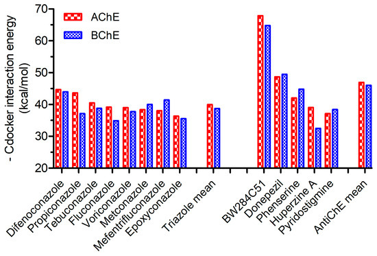 A comparison of interaction energies obtained for triazole fungicides and anticholinesterases after molecular docking into the active site of AChE (PDB code 4PQE [29]) and BChE (PDB code 2PM8 [30]). The energy of the top pose is listed after ranking by CHARMm-based scoring function CDOCKER Interaction Energy [38].