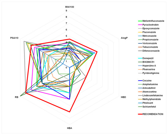Radar plot of physicochemical properties (molecular weight, MW; lipophilicity coefficient, logP; number of hydrogen bonds donors, HBD, and acceptors HBA; rotatable bonds, RB; polar surface area, PSA) of the studied compounds (Table S1, Figure S1). Recommended values for CNS-active drugs are presented by a red line [42].