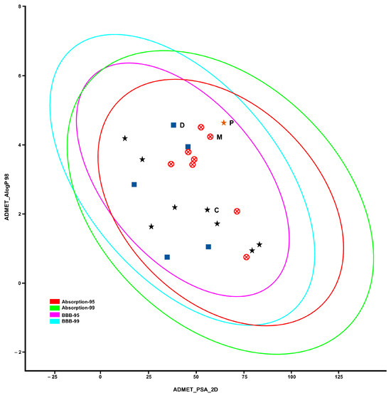 Blood–brain barrier permeability plot. ADME (absorption, distribution, metabolism and excretion) properties of the studied compounds were obtained; calculated lipophilicity (AlogP) and polar surface area (PSA) are correlated (Table S1). Mefentrifluconazole (M) and other triazoles are represented as red crossed circles, pyraclostrobin (P) is gold star, donepezil (D) and other anticholinesterases are blue squares and cocaine (C) and other CNS-active compounds are black stars. The areas within magenta (BBB-95) and red (Absorption-95) ellipses represent compounds with good BBB permeability and human intestinal absorption [41].
