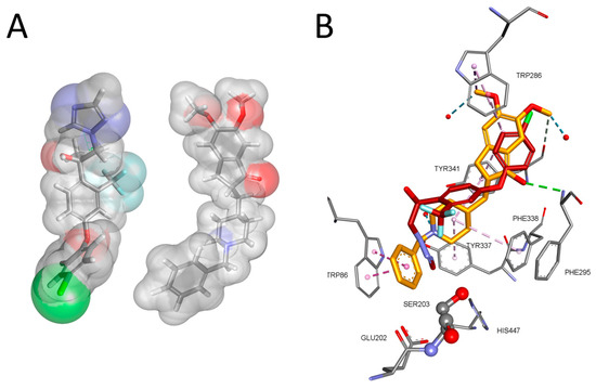 Comparison of 3D structures of mefentrifluconazole (left) and AChE inhibitor donepezil (right) (A). Comparison of binding pose in human AChE of donepezil (carbon atoms are gold; PDB code 6O4W) [43] and mefentrifluconazole (carbon atoms are dark red; see Figure 3A) (B).