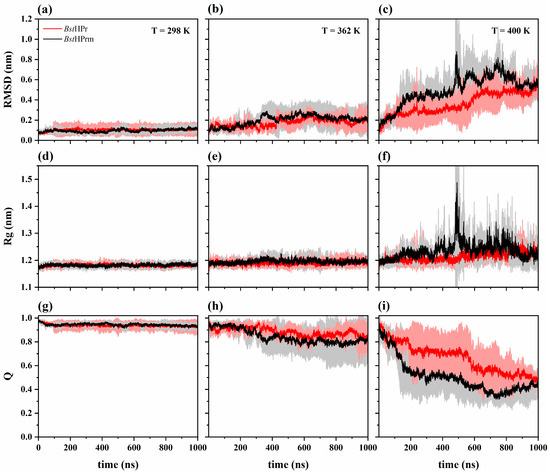 Time evolution of the: (a–c) RMSD; (d–f) Rg; and (g–i) Q for the BstHPr (red line) and BstHPrm (black line) proteins at 298 K, 362 K, and 400 K. The solid lines and shaded areas represent the average values and their standard deviation values from the three replicas of MD simulations, respectively. Details on these trajectories and the average values for the temperatures analyzed are given in Figures S1–S3 in the Supplementary Materials.