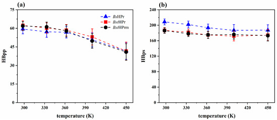 Average values and standard deviation of the (a) HBpp and (b) HBps for the BsHPr, BstHPr, and BstHPrm proteins at 298, 333, 362, 400, and 450 K. The values have been calculated from the three replicas of the MD simulations. Symbols represent the avg values, and the SD values are indicated with bars. The dashed lines are only guides for the eye. Table S4 of the Supplementary Materials shows the corresponding numerical values. The boxplots of these analyses are given in Figure S13 of the Supplementary Materials.